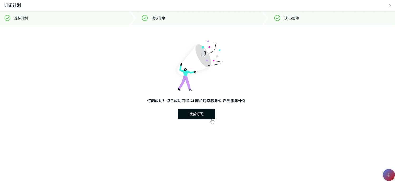 本手册旨在指导用户从营销页进入订阅流程,完成在线签约,成功开通「AI 商机洞察服务包」。