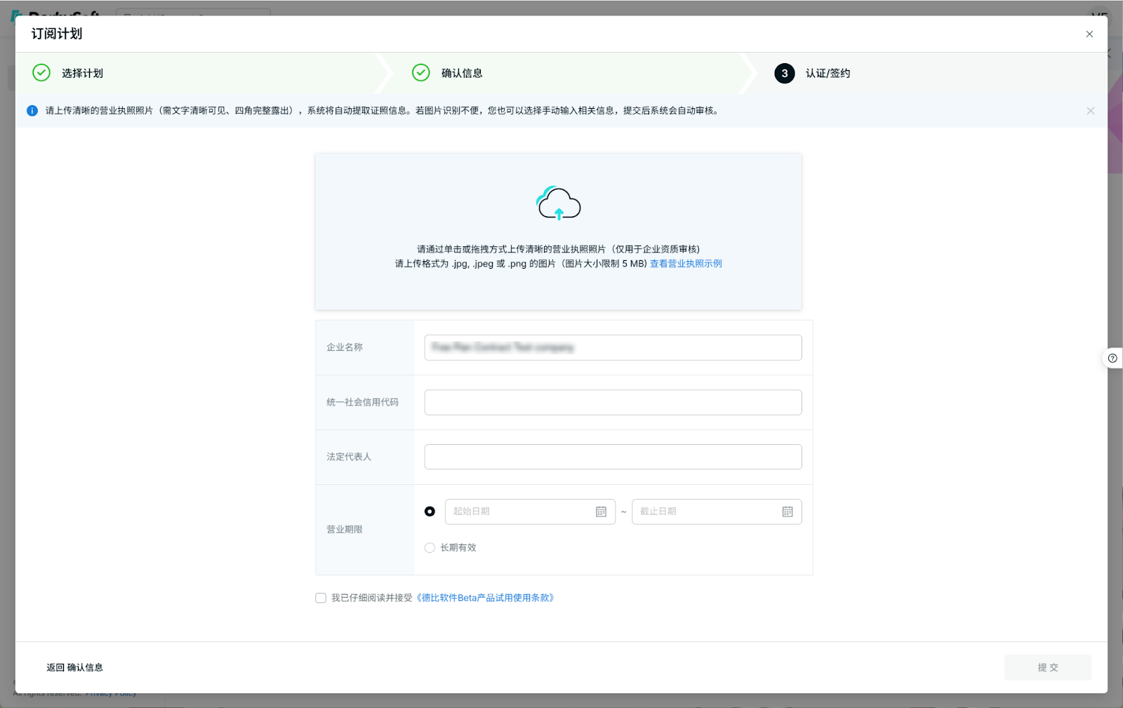 上传公司营业执照,系统会自动识别营业执照上的信息。