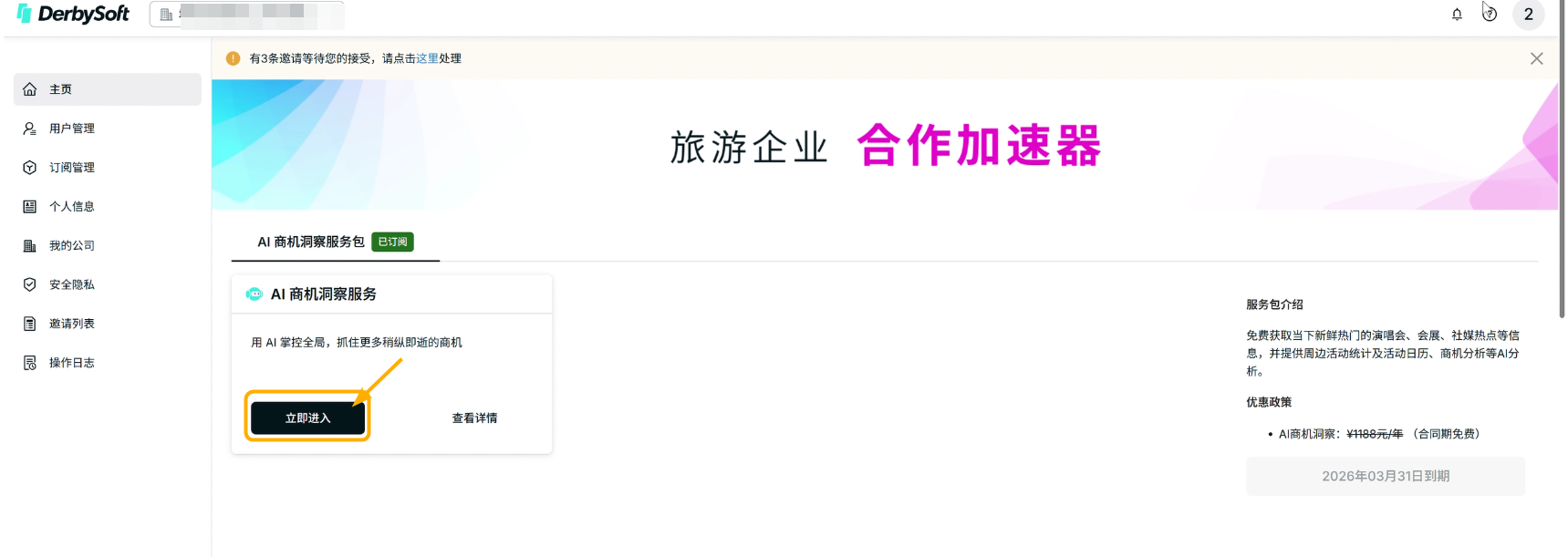 - 登录成功后,系统自动跳转至德比软件平台首页订阅 AI 商机洞察服务包 。